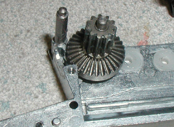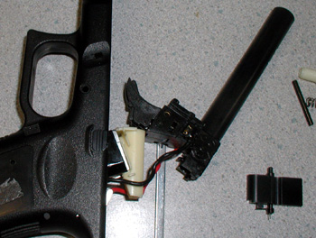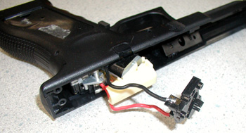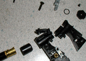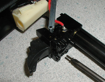 バレル&チャンバーAssyが外せます、これでメカボックスを本体から取り外す準備が出来ました。メカボックスはグリップ底の方から抜き取ります。コードに傷をつけないように気をつけましょう。